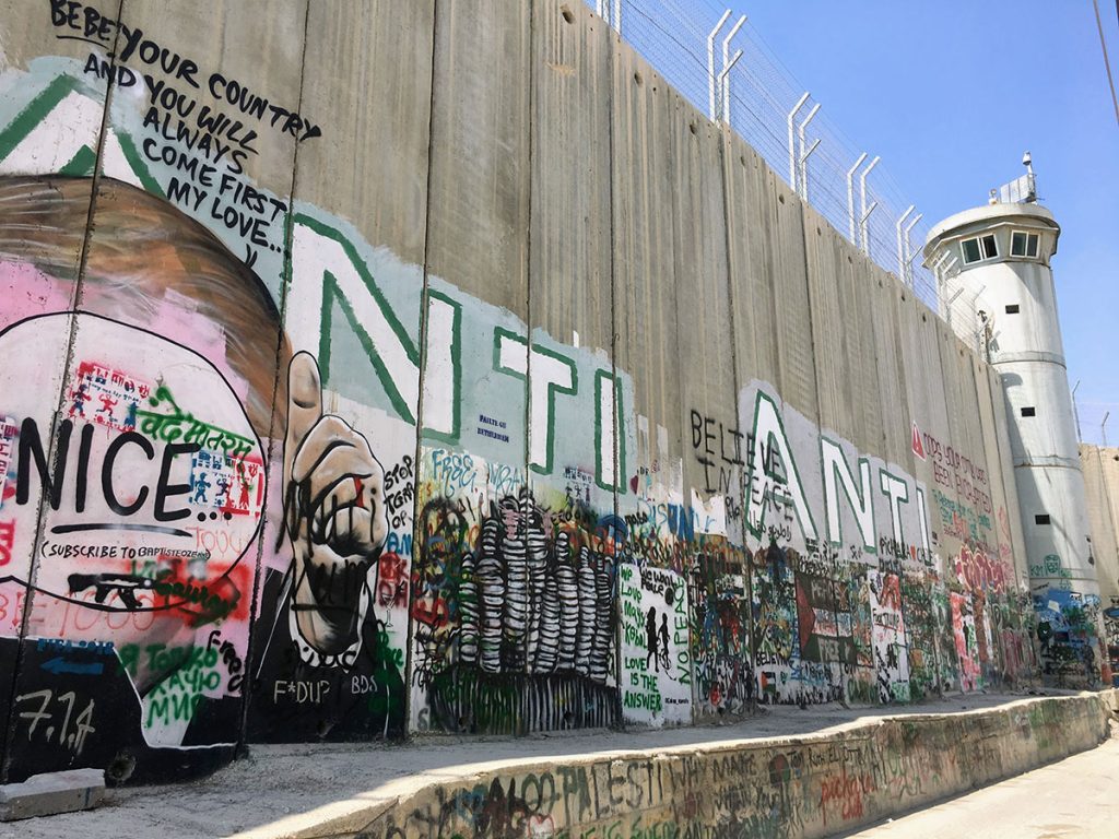 伯利恆有幅令人無法視而不見、長約700公里、高8米的圍牆,那是以色列人為防範巴勒斯坦恐怖襲擊而築起的。Yamen 是我們的巴勒斯坦導遊,當他每次帶我們來到伯利恆的時候,總會着我們沿着城中的牆慢慢地走。他有時向我們指着那些零星散落在牆腳邊的催淚彈碎片,說那些碎片都是以色列士兵與巴人在隔離牆旁邊發生衝突的痕跡。沿着百米高的長枱頭向上望,那是一個個慘灰色、圓柱形的軍隊哨站,以色列士兵不時向外探出頭,觀察周遭的環境。