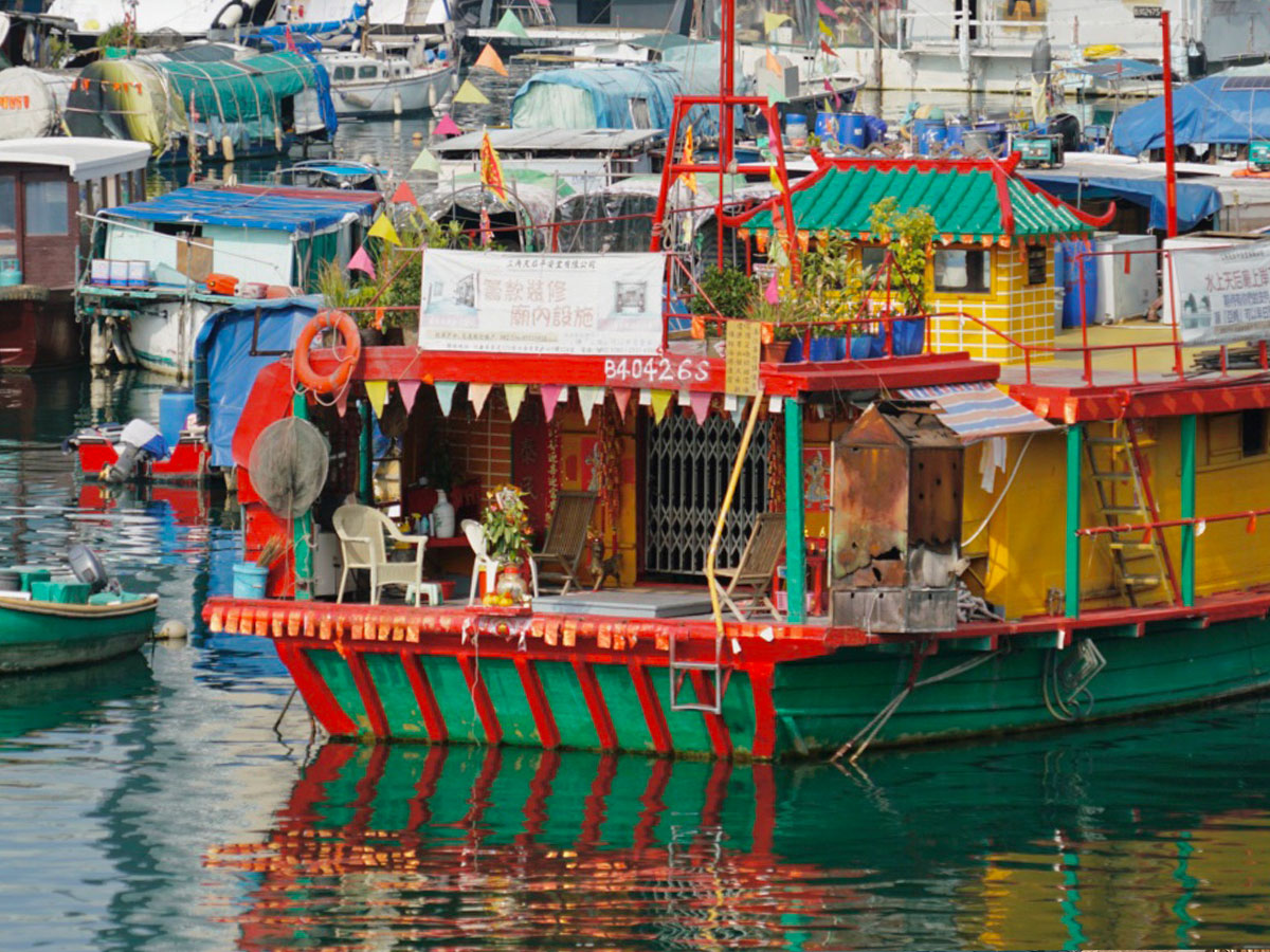 避風塘內,還有一艘紅色的中式漁船,那是香港唯一一艘廟船——三角天后平安堂,供奉着天后娘娘。雖然廟宇將遷往陸上,但現在仍能看見廟船的蹤影。