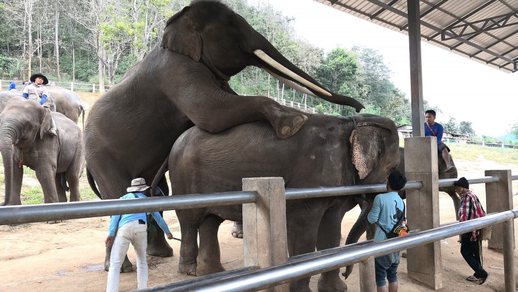 探大象的那位朋友曾目睹令人心碎的一幕,一隻母象被象伕安排與公象交配。母象後腿交叉夾緊,是不情願的意思,但象伕卻以鈎、尖刺來控制母象。這是因為跟小象自拍同樣是賺錢的節目,但小象會長大,於是偽保育營需要更多小象。長大了的小象,很大機會被賣到其他旅遊景點甚至馬戲團等。失去孩子的象媽媽,有的踽踽獨行,有的不斷低頭來回搖擺,有的嘗試偷走人家的小象⋯⋯