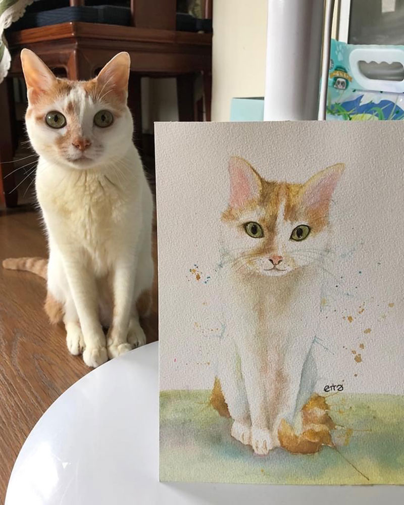 如果你看過畫「物」Em’s Pet Project的動物畫,一定愛上,你會發覺每一隻動物神態都是獨一無二。「每次畫畫或義務幫別人的寵物畫畫(再強調一次是慈善用途),我都會先探訪寵物主人,了解牠們的性格,再用心觀察貓兒的神態;最重要是一雙眼!」