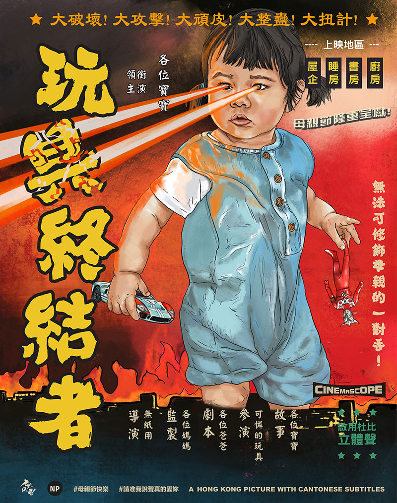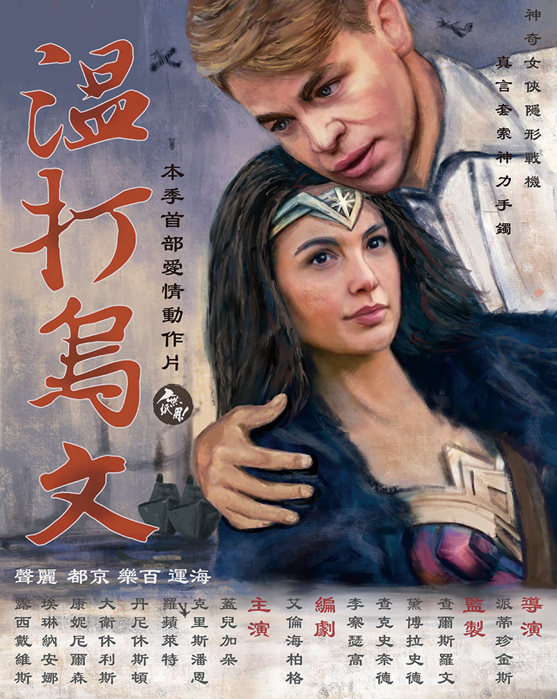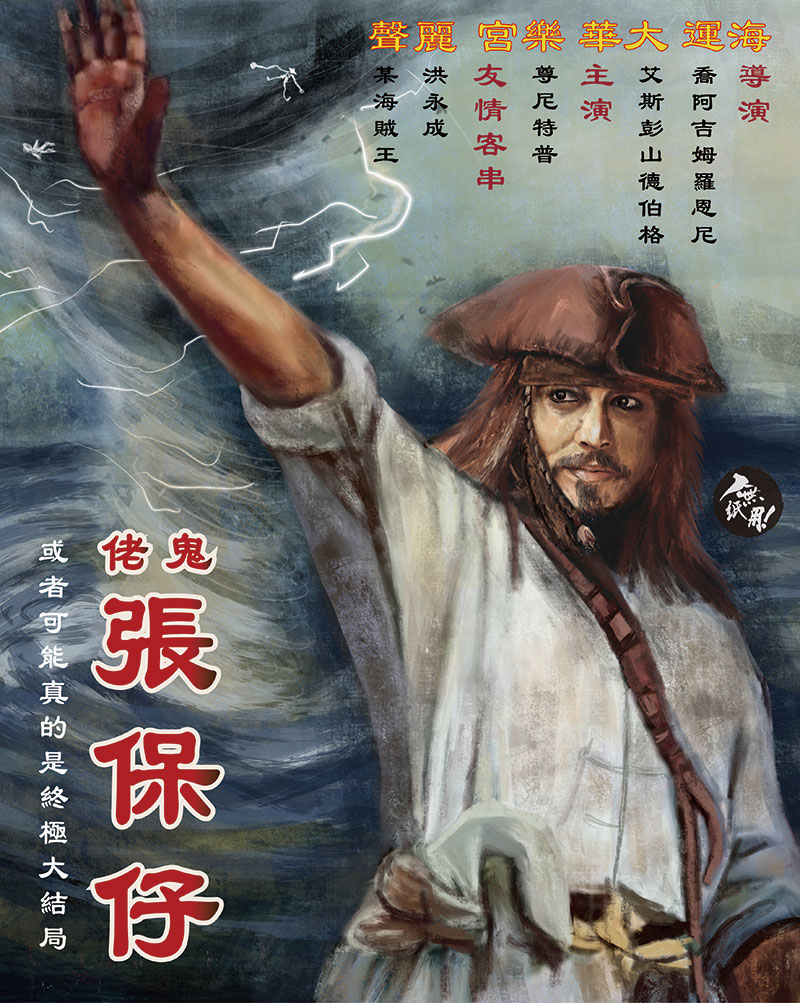 舊時的電影海報愛以獨有的廣東話直譯「鬼佬」電影名字,恆仔保留了這個特色,以喜愛的英雄片出發,設計了《溫打烏文》(Wonder Woman)海報,又以「鬼佬」張保仔形容加勒比海盜,從戲名、字體、院線、顏色、人物設計等等都刻畫得一絲不苟,加上充滿幽默感的港式文案,既為海報增添了熟悉感,又搞鬼得讓人忍俊不住,忍不住每張作品都慢慢細看。