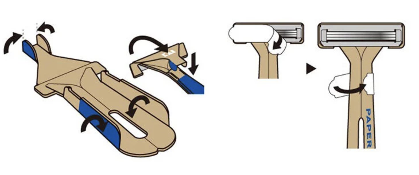 紙製剃刀是使用食品級防水紙,可以放心用水沖洗,水溫40ºC以下仍能正常使用。剃刀未摺合時是能完全攤平,厚度只有3.1mm,重量只有約4克。除了使用平裝包裝外,紙製剃刀亦故意沒有提供「男性化」或「女性化」的包裝,而是提供五隻「大家可能都會喜歡的顏色」,同時亦打破了大部分日本品牌一直以來過度包裝的文化。