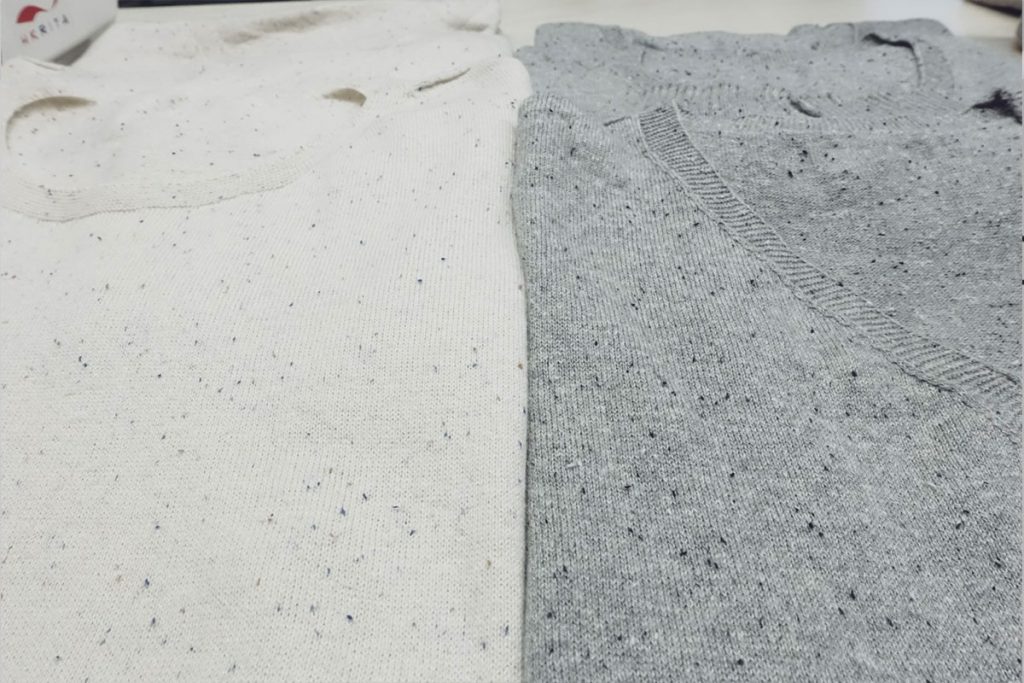 暫時系統可以製造兩個針織衫款式,分別是圓領和 V 領。在針織的過程中,系統亦可能會視乎可用的舊衣紗線量多少而混入新紗。這兩款就是製成品。技術人員表示過程最快只需要四小時,但由於現在客量眾多,所以你帶去整容的舊衫,要待數個星期才可以取回。