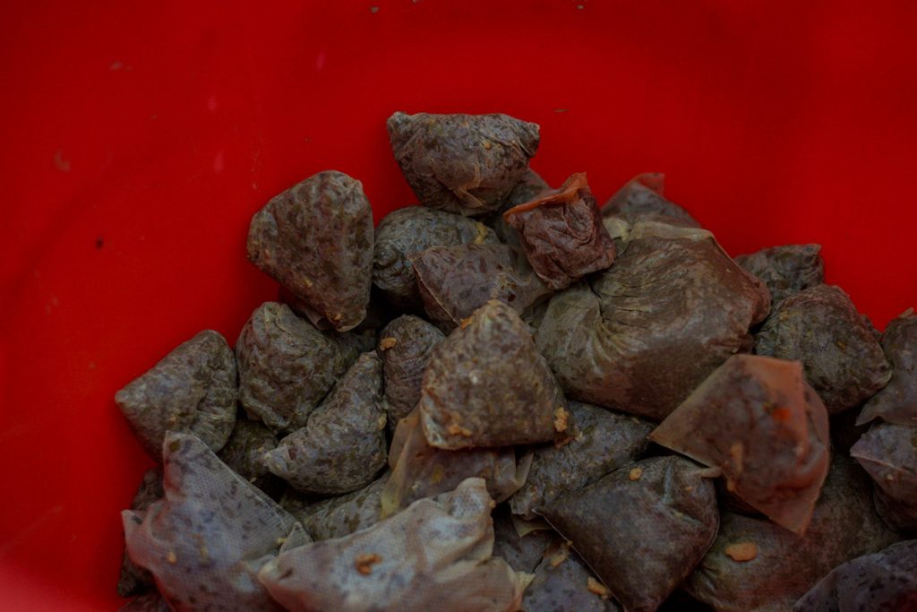 現時香港並沒有回收茶渣的系統,一般也是當作普通廚餘處理。去年五月,草根文化館獲環保及自然保育基金資助,開展「渣皮goal」環保基金旺角小店輕便廚餘回收計劃,回收茶渣及果皮。自此,Marcus和Steph便每周至少三次,推著紅色膠桶向旺角小店收茶渣,回收後的茶渣會被運至位於大角咀的公司暫存,儲夠200至300公斤後會再運至本地農場用作化肥。