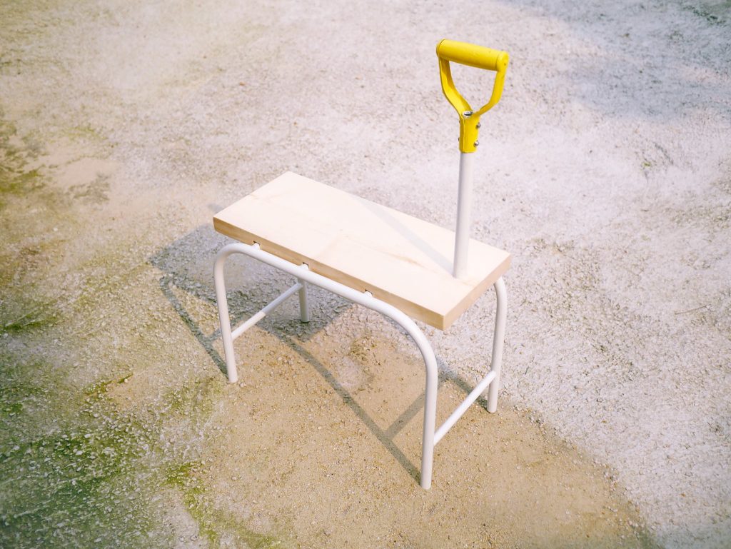 其中一位參加者用舊滑板,加了兩個廁所泵和水桶手柄,製成一張「便攜長椅」。