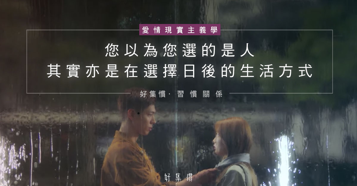 愛情就是,您選擇一個怎樣的人,就等於選擇了怎樣的人生。對方的外貌、個性、嗜好、背景、價值觀等所建構的,不只是作為伴侶的條件,而是您倆將來生活的預設條件。或許在情愫初長的階段,目光只聚焦於愛情的濃度,但當熱戀魔法退卻,大家開始如夢初醒回復理智後,就需要將眼界放遠一點,腦海中預演繼續走下去的人生會成了哪個模樣。您以為您選的是人,但其實您亦是在選擇日後的生活方式。