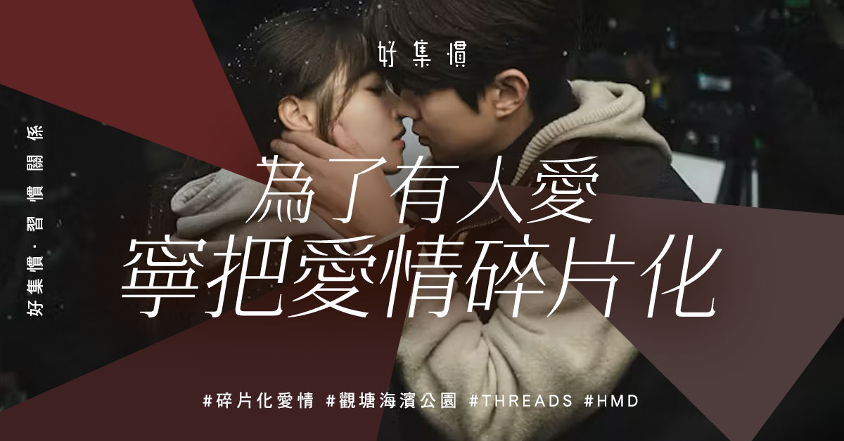 以上看似不相關的三個現象,我卻看到現代人的碎片化愛情觀。一段愛情由相識、瞹眛、拍拖到親密接觸,卻可以被分割成在Threads徵友、在匿名交友軟件瞹眛,在觀濱與陌生人親密接觸,重點是這些不是宅在家中的中老年人,而是青春少艾。相對費時又費神的交友約會模式,甚至是收兵,他們寧願選擇目的性強和速食的碎片化愛情,感受海量的被愛、被需要,從而得到滿足?又或是去尋找更多的愛和被需要。他們最終想尋獲的是愛情,是一段關係,還是只是單純時興的消遣活動?我不知道,也許他們也不知道。