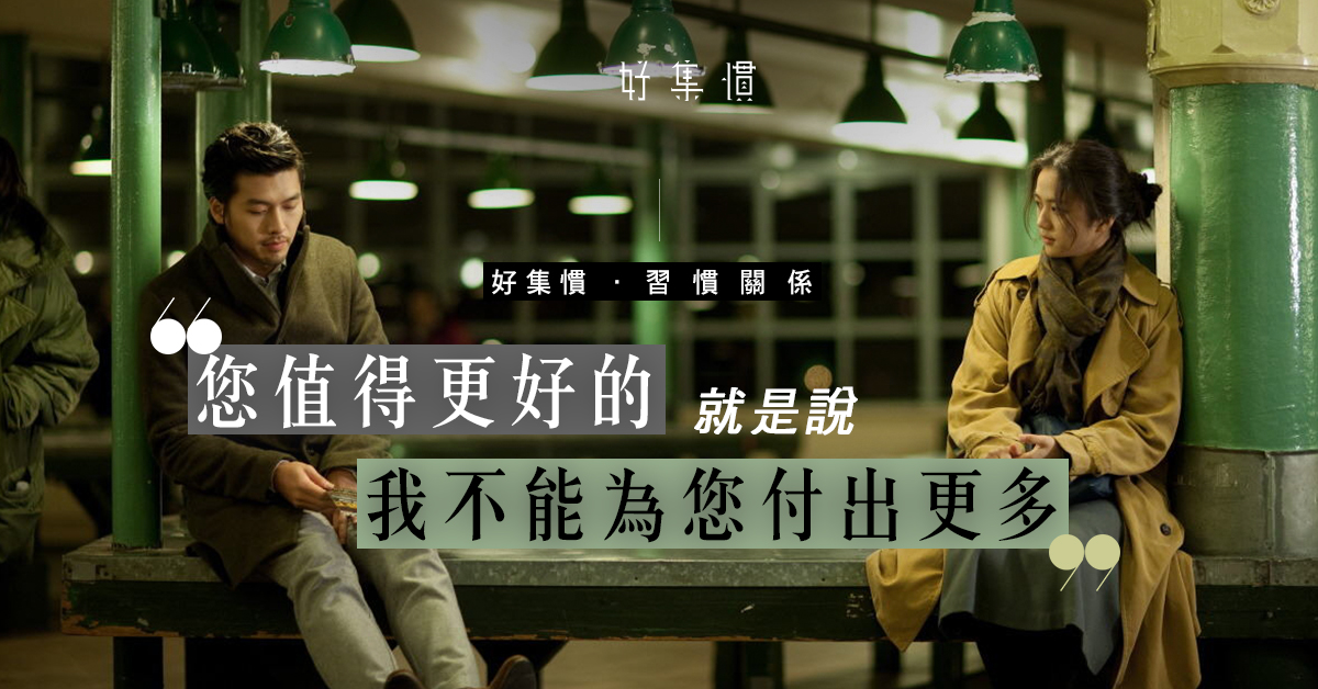 在過往的關係中,最耳熟的完場對白是,「抱歉我不能給您幸福,您值得找到比我更好的人」。看似最溫柔的説話,卻比單純一句「我不愛你了」還要殘忍千倍萬倍。感覺上對方還愛着您,卻因為不得已的苦衷,放棄他深愛着的您,即使痛苦割愛也只望您幸福,演活了史詩式可歌可泣的浪漫悲劇。無論此話背後的動機是甚麼,愛或不愛,重要的是他選擇了退出,而您該做的不是自責或死纏難打(當然自省是必須的),而是相信,相信您的幸福不在他手裡,因為真正愛您的人,是會努力為您變成更好的人,而不是把您丟給別人。