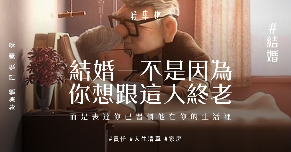 你可能覺得結婚需要一股衝動,像在人生清單上打剔號一樣的快感,才能讓彼此付出重大的努力去適應新的身份,如果你是二十多歲的話,確實可能是這樣。如果你是三十歲以上的話,結婚的意義可能有所不同,那是一種身份認同,認同你們彼此的生活不能缺少對方,認同他是你選擇的親人,到你老了病危時可以幫你簽紙作決定。