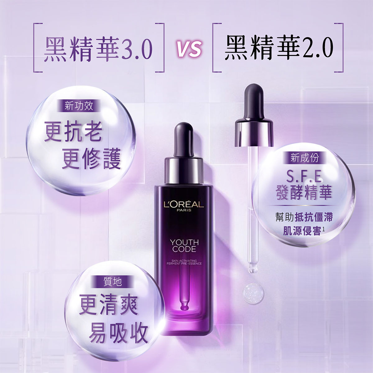 最新的YOUTH CODE發酵精華肌底液,亦即是皇牌黑精華,已全新升級為第3代,對比上一代只是入門級抗初老,黑精華3.0更抗老、更修護,而且質地更清爽易吸收,關鍵是當中蘊藏的跨世代科研,能為肌膚找回青春密碼。