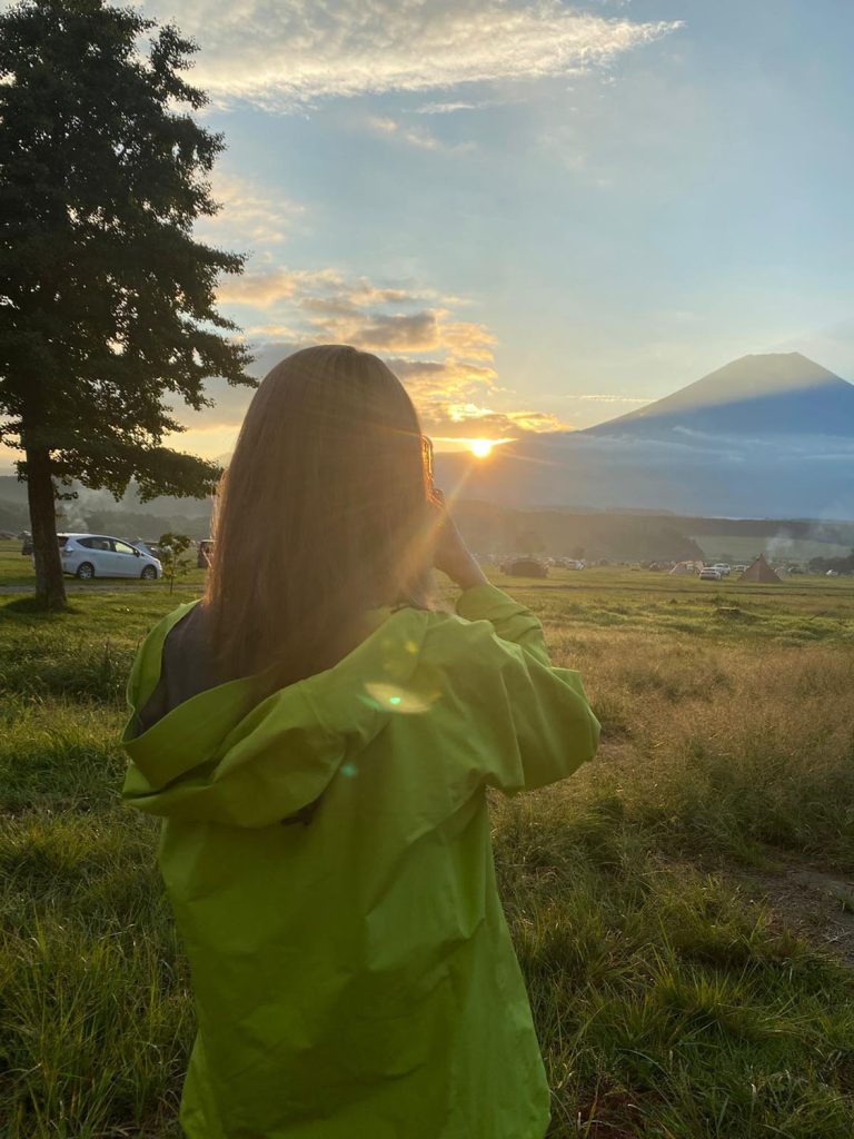 營地天黑不開燈,沒有光害下,一抬頭就能看見星空,「真的很多星星!」點個營火,享受與身邊朋友的交流,在大自然包圍下舒服睡一覺;隔天清晨再早起看日出。本以為大霧籠罩,與富士山無緣,那知晨光乍現,富士山就在眼前,像圓夢一樣,「當下真的很感動,感覺從大自然獲得了能量。」放下手機,只專注享受眼前風景,和身旁的人一起欣賞,打開五官,Ruby 覺得全身心都活在當下,「感覺終於有時間和空間去感受生活,而不是一直與時間比賽。」
